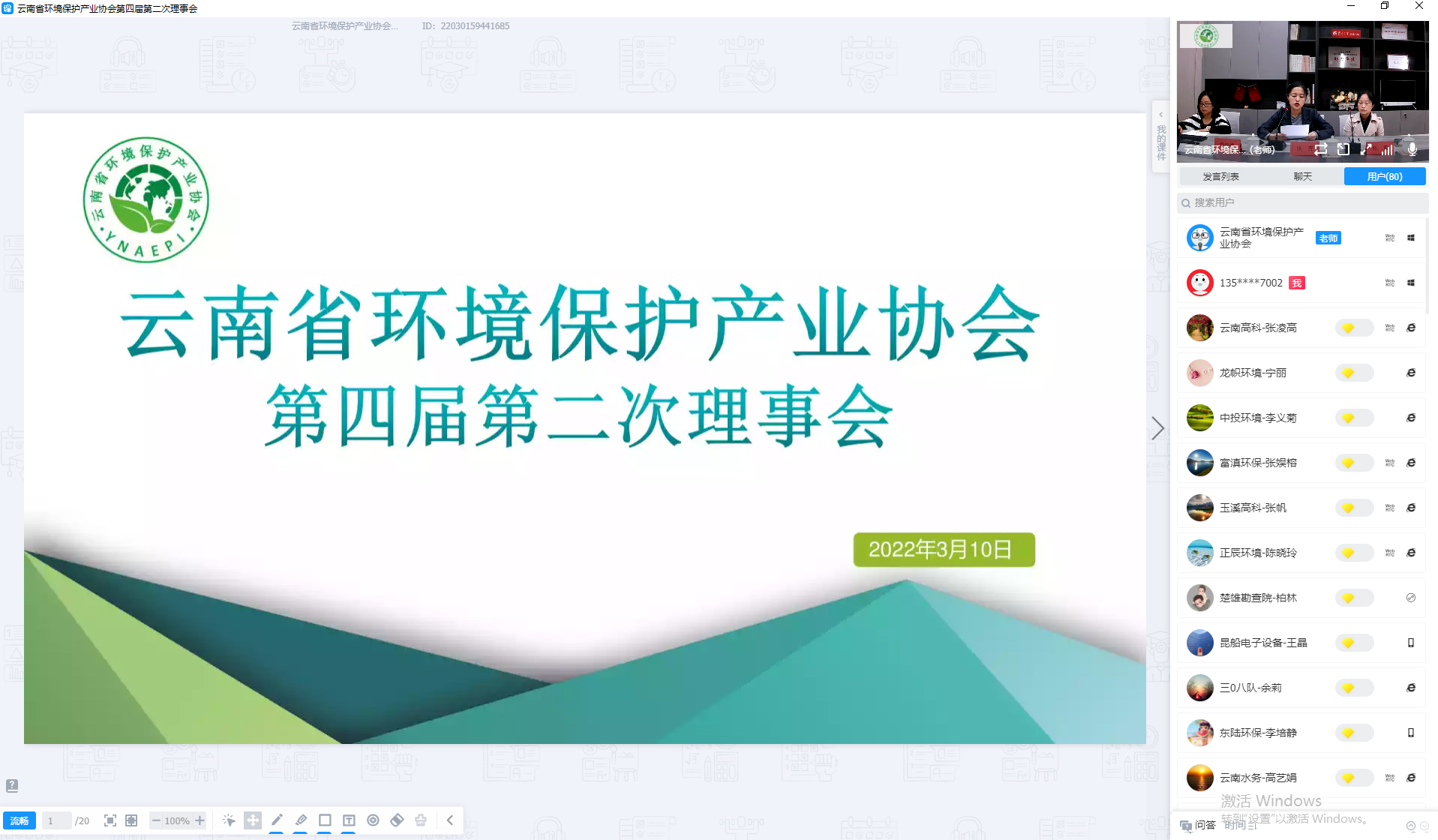3月10日上午9:30,云南省環(huán)境保護產(chǎn)業(yè)協(xié)會第四屆第二次理事會以線上會議的形式召開,會議由第四屆理事會會長張齊主持,第四屆理事會理事及監(jiān)事共計80余人參加了本次會議。