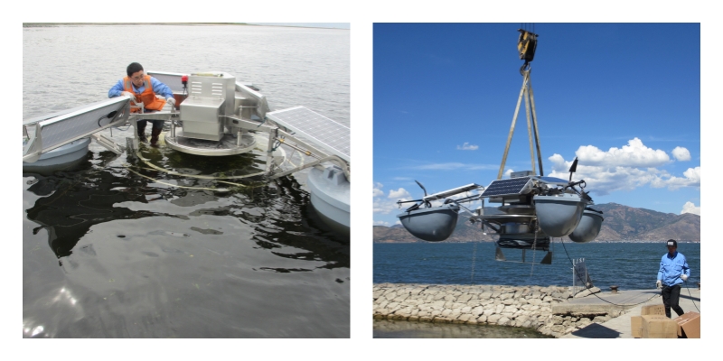 水上對(duì)太陽(yáng)能驅(qū)動(dòng)水生生態(tài)設(shè)備進(jìn)行調(diào)試,以確保設(shè)備能夠正常運(yùn)行