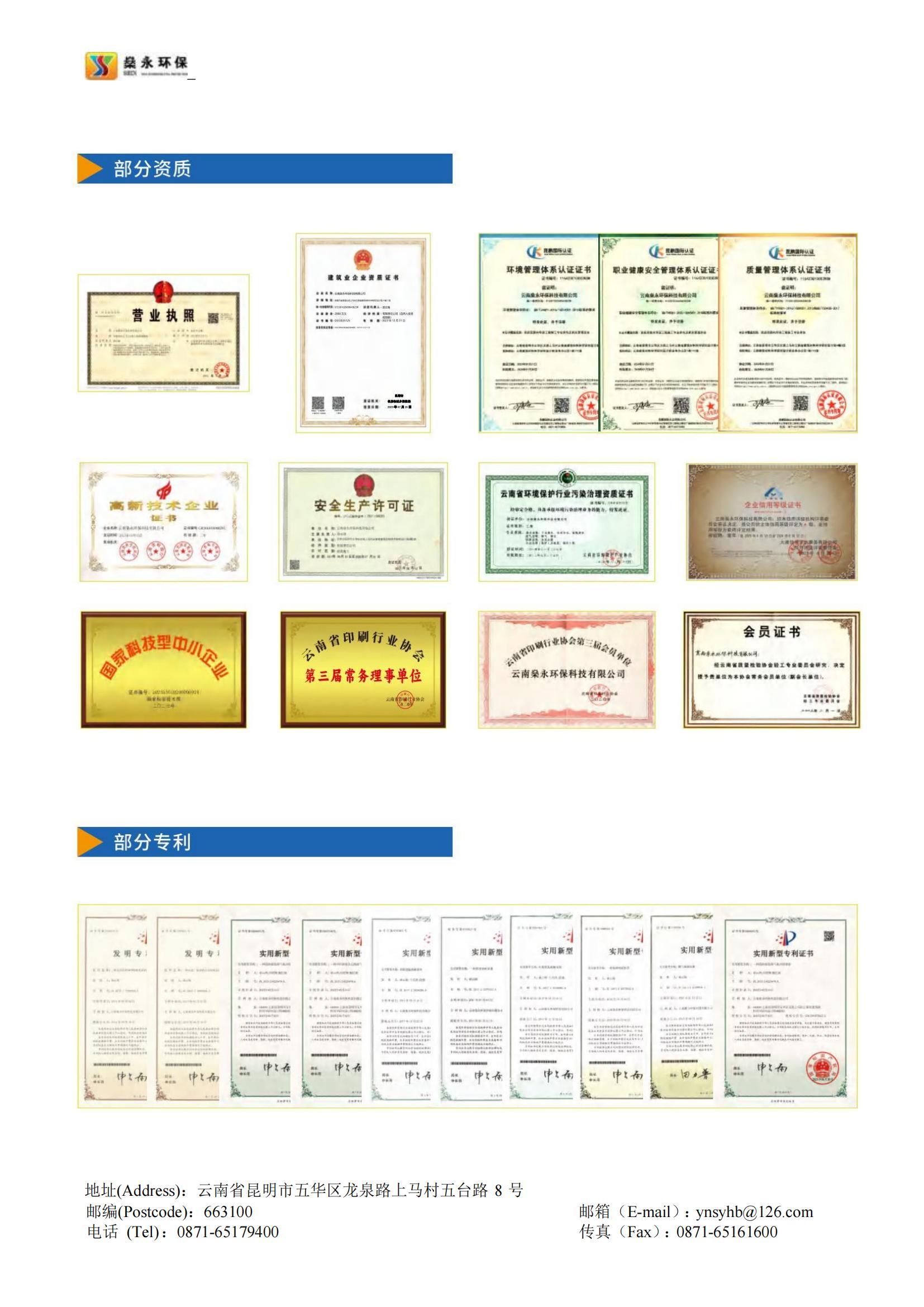 燊永公司堅持“創(chuàng)新、協(xié)作、共贏”的價值觀,以“專業(yè)、專心、專注”為服務(wù)理念,以“求實、求是、求精”為質(zhì)量宗旨,為客戶提供優(yōu)質(zhì)、高效、貼心的服務(wù)。公司獲得國家專業(yè)部門頒發(fā)的《環(huán)境工程專業(yè)承包三級》資質(zhì)、《污染治理乙級》資質(zhì)、《企業(yè)信用等級A級》證書、《云南省科技型中小企業(yè)》認(rèn)定證書、《ISO9001/GBT50430質(zhì)量管理體系》證書、《ISO14001環(huán)境管理體系》證書、《ISO45001職業(yè)健康安全管理體系》證書等多項榮譽和多項的專利技術(shù)。